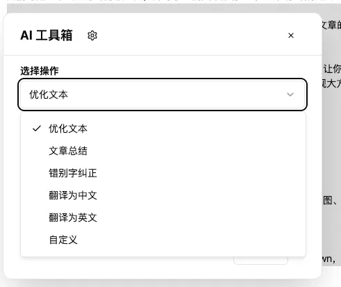 选中文本后支持 AI 操作,可以优化文本,文章总结,错别字纠正,翻译等操作。