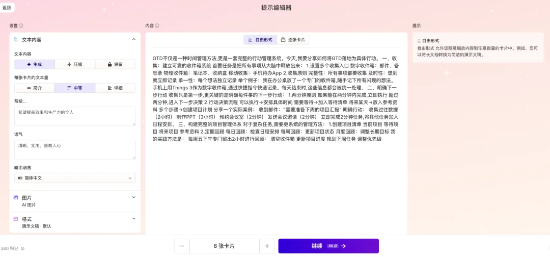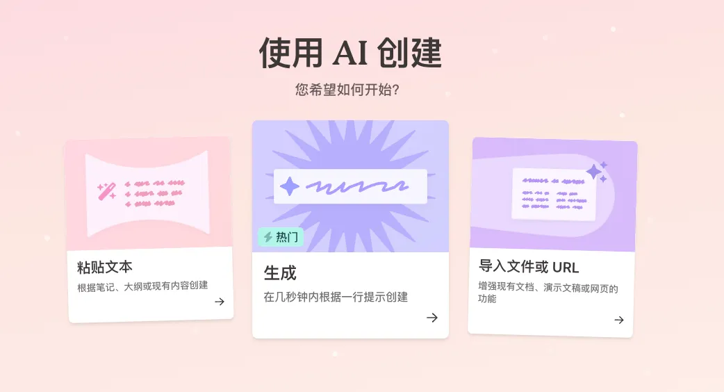 AI 生成: Gamma 的 AI 引擎会自动将你的内容转化为结构化的演示文稿。