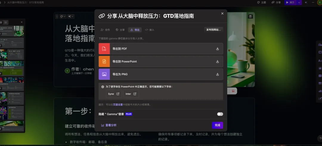 6.导出,可选择导出为PDF,PPT,PNG格式。