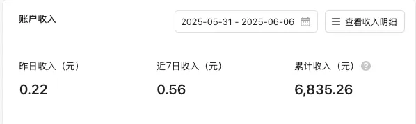 后,搜索了下,找到了在哪查看小程序总的收入。截至到昨天小程序的累积收入为 6835.26 元。这几年的支出大概在 2 千多块,包括一台云服务器和一个域名。总的来说收益大于支出了。