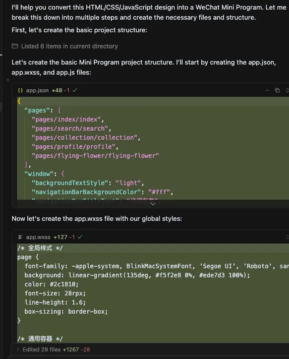确定后,cursor 就开始根据你提供的设计稿件来创建文件了。如下图所示。