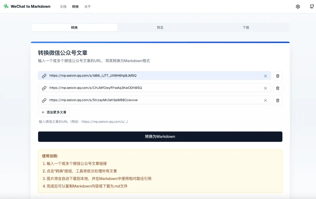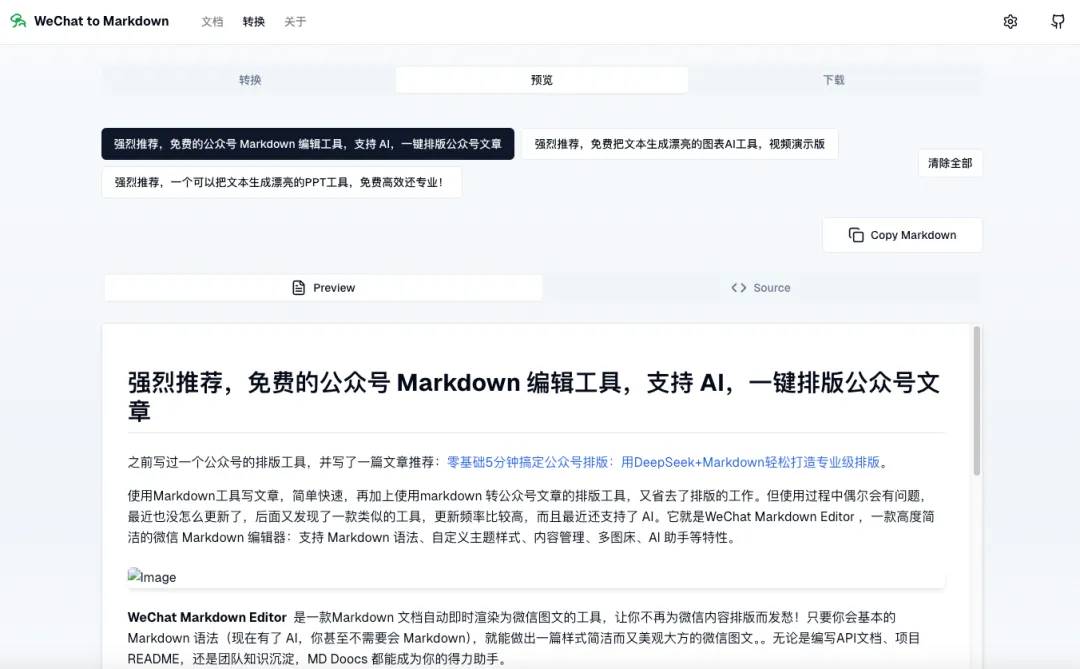 一个网页应用,可将微信公众号文章转换为干净的 Markdown 格式,并支持图片处理。可以下载和同步到 github 上。