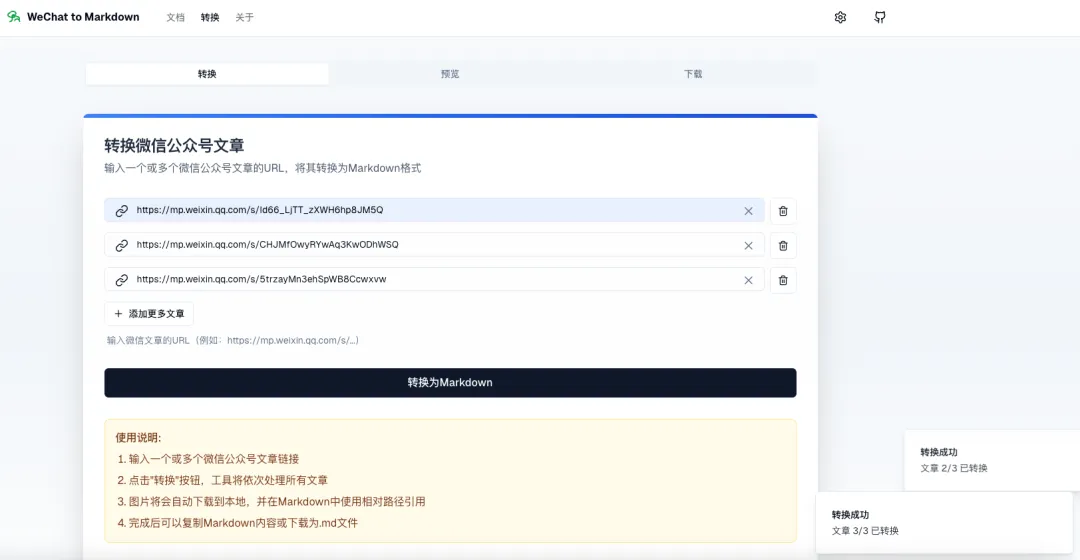 把微信文章的地址粘贴过来,点击转换按钮。(新增加了批量操作,可以添加多篇文章)