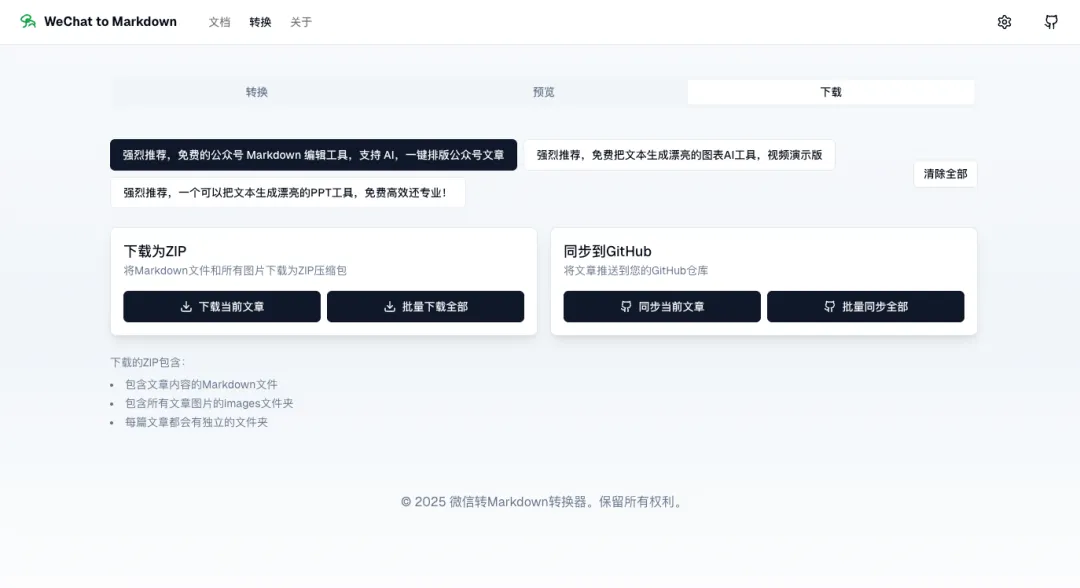 • 💾 提供仅下载 Markdown 文件或完整打包(含图片)的选项,以及同步到 github 上的选项。