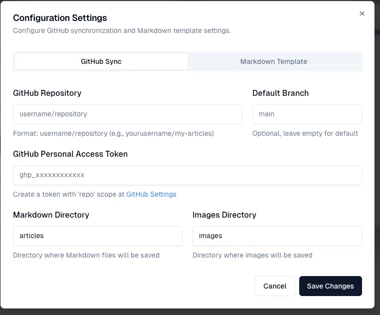 markdown 的文件头可以通过模版配置。同时可以配置的还有同步到 github的配置。